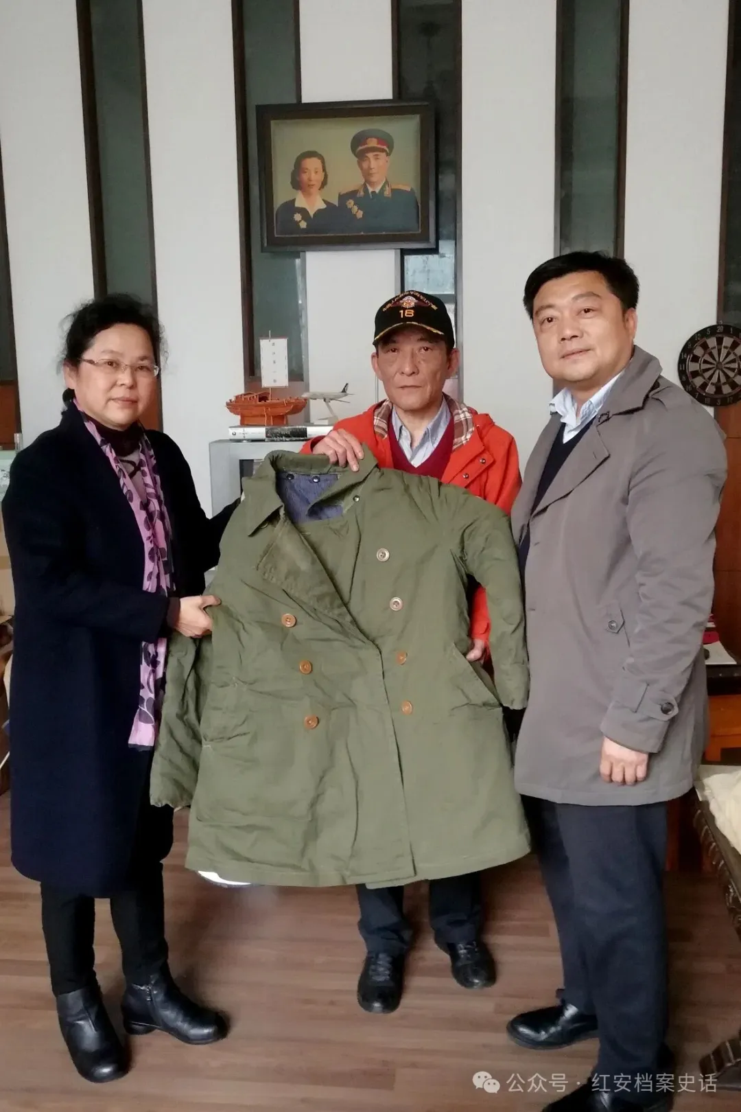 2018年11月21日,刘飞将军长子刘建华先生(中)向黄麻纪念园捐赠父亲穿过的棉大衣。右为时任湖北红安革命纪念地管理中心党委副书记、主任刘晓军。